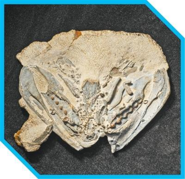 钝齿宏颌鱼化石,发现于云南曲靖志留纪晚期(约4.23亿年前)地层中,全长1米有余,是当时最大的鱼类。从完整的头颅化石中可以看到,嘴里交错长着小帽状的“齿垫”,上面密布小牙。赵钢摄