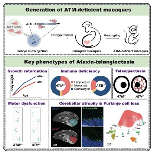 研究不仅创建了首个能真实模拟A-T神经系统损伤的非人灵长类动物模型,也是目前唯一能系统研究这一罕见病神经退行性机制的模型。该研究弥补了长期以来小鼠模型的局限性,证明ATM基因缺失与A-T病程的直接因果关系,并为进一步探索发病机制、寻找新的分子靶点提供了关键依据。同时,该模型创建也为新药研发和疗效评估提供了一个高度可靠的实验平台。