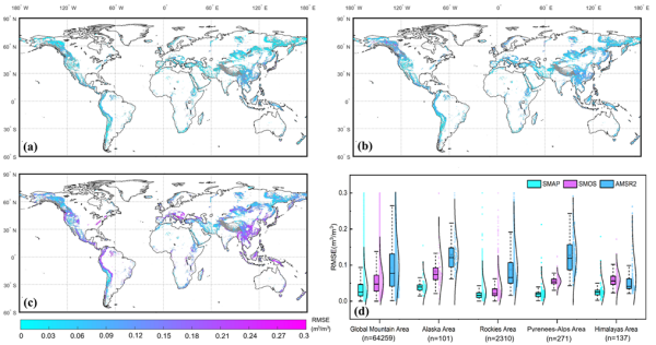 全球山区SMAP土壤水分产品的均方根误差空间分布