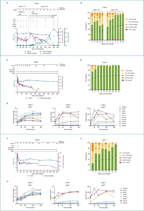 研究团队在三例T1D患者中,分别采用自体或异体内胚层干细胞来源的再生胰岛,在不同免疫抑制策略下评估疗效与安全性,取得了良好的临床结果。研究发现,内胚层干细胞来源的再生胰岛经门静脉移植后,在T1D患者中实现了稳定的血糖控制,甚至实现了外源胰岛素的完全脱离。